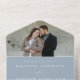 Elegante invitación de boda "todo en uno" con tu foto de compromiso en la parte superior de la invitación. Sus nombres y detalles bodas se muestran en letras blancas clásicas con acentos modernos de escritura caligráfica a lo largo de todo el diseño con un fondo azul polvoriento. La foto de la invitación a la boda todo en uno incluye una tarjeta RSVP desmontable que puede enviarse por correo como postal. Diseñado para coordinar con nuestra colección de bodas de caligrafía elegante Dusty Blue.