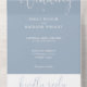 Esta minimalista invitación a una boda completa presenta una tipografía elegante sobre un polvoriento fondo azul. La invitación incluye una tarjeta RSVP perforada que puede ser dirigida individualmente o dejada en blanco para que pueda escribir a mano los detalles de la dirección de su invitado. Diseñado por Thisisnotme©