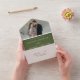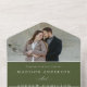 Elegante invitación de boda "todo en uno" con tu foto de compromiso en la parte superior de la invitación. Sus nombres y detalles bodas se muestran en letras blancas clásicas con acentos modernos de caligrafía a lo largo de todo el diseño con un fondo verde oliva. La foto de la invitación a la boda todo en uno incluye una tarjeta RSVP desmontable que puede enviarse por correo como postal. Diseñado para coordinar con nuestra colección de bodas de la caligrafía elegante Olive Green.