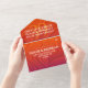 Haz que el 39º aniversario de bodas de ágata sea una celebración inolvidable con estas invitaciones conmemorativas todo en uno. La elegante tipografía blanca sobre fondos que van desde un naranja quemado hasta un púrpura profundo añade un toque memorable para esta ocasión especial y este hito extraordinario. Personaliza con los nombres de la feliz pareja, fecha del lugar de celebración, dirección y hora, además de las direcciones de remitente y destinatario.