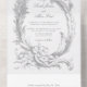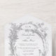 Este clásico conjunto de diseños decorativos históricos se inspira en los grabados del siglo XVIII del pintor de corte francés Alexis Peyrotte, que presenta un gris claro ornamentado con un marco blanco de hojas de acanto, rollitos ornamentales, flores y hojas. Incluye un campo de texto para su monograma/iniciales. Este práctico formato todo en uno incluye una tarjeta RSVP/Response desmontable.