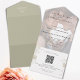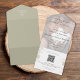 Este diseño presenta una invitación de boda fotográfica "todo en uno", con vegetación, un sello y envío simple, botánico, elegante, un juego de presupuesto de triplias florales, un código QR y fondo verde sabio, y guión de caligrafía