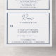 Esta invitación boda todo en uno, de color blanco y azul marino minimalista, tiene un RSVP desgarrador en la parte inferior para comodidad y ahorro de costos, sin sacrificar elegancia y estilo. El diseño clásico tiene una cubierta de vieira en la parte superior, con un marco alrededor del borde y una elegante caligrafía de guión para texto seleccionado. Consulte la colección de la suite de invitados de boda coincidente y más productos coincidentes.