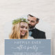 Elegante elegancia azul polvoriento todo en uno o invitación boda privada y invitación a la recepción de boda con una postal RSVP desgarradora que ofrece una cómoda respuesta sin sobres de sus invitados. Este diseño presenta su foto en el flap interior superior, "Feliz eterno después del Fiesta" en una mezcla de tipografía simple en blanco y un guión blanco en moda con toques y nombres en un guión característico. La tarjeta RSVP sobrepone una segunda foto.