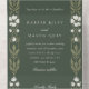 Esta invitación de boda todo en uno con una conveniente tarjeta lacrimógena RSVP encarna la sofisticación y elegancia, inspirándose en el periodo Art Nouveau. Se ha diseñado cuidadosamente con un rico fondo verde forestal, adornado con delicados motivos florales blancos y acentos verdes sabrosos, que simbolizan el crecimiento y la vitalidad de la unión. El frente de la invitación presenta los detalles del día especial en un elegante estilo, rodeado por la belleza de elementos de inspiración natural. La tarjeta RSVP desmontable mantiene el diseño cohesivo y ofrece una forma sencilla y elegante de responder a los huéspedes. Las esquinas redondeadas le dan un toque moderno a la temática de inspiración vintage. Esta suite de invitados es perfecta para parejas que buscan una combinación de comodidad, diseño clásico y la elegancia natural de un jardín encantado.