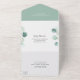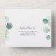 Plantilla única de invitación de boda All In One con tarjeta rsvp para una opción conveniente y de bajo costo para parejas con experiencia en presupuesto. La elegante invitación a la boda presenta un diseño sencillo con un paisaje de eucaliptos pintados en color agua. La solapa trasera tiene la dirección de retorno sobre una sombra de color verde medio a juego. Esta rústica invitación botánica para celebrar bodas todo en uno con un toque moderno es ideal para un boda de primavera o verano.