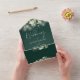 Todo en una invitación de boda con luces de cuerda de bonito, vegetación floral botánica y tipografía elegante sobre un fondo verde esmeralda. La invitación incluye una tarjeta RSVP perforada con un código QR. Diseñado por Thisisnotme©