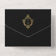 Invitación a una boda vintage, elegante e inusual en negro y oro con un monograma en un escudo de imitación de oro de ambos lados del pliegue y un RSVP desmontable con cuadrados falsos de Relieve metalizado de oro. El texto es dorado (excepto una M). El fondo es negro. Cuando se dobla, parece un sobre, con el monograma del boda impreso en escudo en el pliegue, y se puede enviar por correo. El RSVP desmontable tiene en su espalda la dirección impresa y también un lugar para el sello, por lo que se puede enviar por correo como postal.