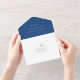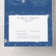 Esta invitación a una boda azul marino y plateado marca el inicio de tu espléndido viaje matrimonial. Combina cuidadosamente la invitación principal con una tarjeta RSVP desmontable y una sección para los detalles del boda, incluyendo su dirección web, presentando una armoniosa mezcla de elegancia y lujo. Decorado con motivos del cosmos, como la luna creciente, un halo de sol radiante, estrellas brillantes, planetas vagabundos y grandes constelaciones, captura el enigmático encanto de un cielo nocturno cubierto de estrellas. Diseñado a medida para temas como "Under the Stars", "Written in the Stars" o "To the Moon and Back", es una invitación para que tus invitados se unan a una encantadora y romántica odisea.