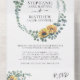 Estas invitaciones nupciales presentan un diseño floral acuático con girasoles y follaje de hojas de eucalipto. Personaliza tu texto. También se dispone de material de papelería de correspondencia.