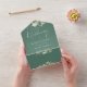 Todo ello en una invitación a la boda con hojas rústicas de vegetación botánica y tipografía elegante sobre un fondo verde eucalipto. La invitación incluye una tarjeta RSVP perforada con un código QR. Diseñado por Thisisnotme©