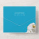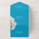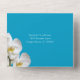 Invitación a la fiesta de cumpleaños de orquídeas en azul acuático. Una invitación especial para un partido todo en uno con tarjeta RSVP desmontable tiene orquídeas blancas realistas sobre papel azul bonito. La redacción en blanco es una fuente de escritura moderna. La tarjeta de respuesta tiene un panel en blanco, por lo que el nombre y la respuesta son fáciles de leer. Las orquídeas son tallos blancos con centros amarillos y decoran el interior y el exterior de las cartas. Se han proporcionado tres plantillas de direcciones para el destinatario, la dirección de retorno y la dirección de la tarjeta de respuesta.