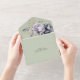Su boda es una celebración de amor y compromiso, y esta invitación a una boda todo en uno con un diseño floral de moreno negro y lavanda en un fondo verde de salvia pálido le dará el ambiente perfecto para su gran día. Aprovecha el encanto de esta invitación y deja que tus invitados sientan la emoción desde el momento en que la abren. Las invitaciones de boda todo en uno son hermosas y prácticas al combinar la invitación de boda con una postal RSVP fácil de quitar perforada. También son rápidos y fáciles de preparar para el correo. Simplemente dirija la invitación, doble el pliegue trasero y selle con los pegatinas claros incluidos. Una vez que sus invitados reciben la invitación, simplemente rompen la tarjeta RSVP perforada y la tiran por correo.