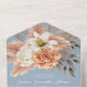 Anuncia tu boda con estilo con esta elegante invitación todo en uno que presenta una mezcla romántica de flores de acuarela en durazno y follaje en azul polvoriento. Incluye tarjeta postal desglosable para RSVP y diseño de sobre con monograma. Personaliza fácilmente con tus detalles y agrega una foto para un toque personal. Para asistencia, envía un correo electrónico a bpkolman@gmail.com.