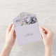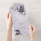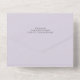 Su boda es una celebración de amor y compromiso, y esta invitación a una boda todo en uno con un diseño floral de moreno negro y lavanda marcará el estado de ánimo perfecto para su gran día. Aprovecha el encanto de esta invitación y deja que tus invitados sientan la emoción desde el momento en que la abren. Las invitaciones de boda todo en uno son hermosas y prácticas al combinar la invitación de boda con una postal RSVP fácil de quitar perforada. También son rápidos y fáciles de preparar para el correo. Simplemente dirija la invitación, doble el pliegue trasero y selle con los pegatinas claros incluidos. Una vez que sus invitados reciben la invitación, simplemente rompen la tarjeta RSVP perforada y la tiran por correo.