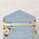 Elegant, rustic, botanical, dusty blue wedding invitation with watercolor flowers, sunflowers, greenery and photo of the couple.