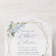 Invite a los amigos y a la familia con estilo y establezca el tono de su día especial con esta encantadora invitación de cumpleaños. El diseño presenta flores de color azul y blanco, vegetación, confeti dorado y marco dorado sobre fondo blanco.