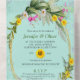 Los campos de flores, con un fondo floral suave y verde pálido, están decorados con tonos amarillos, rosas, rojos, verdes y blancos. Todo en una carta para la pareja boda.