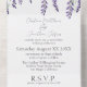 Esta invitación a la boda presenta un diseño todo en uno con una tarjeta R.S.V.P. incluida en la parte inferior. El fondo es un blanco sencillo y elegante, con flores de glicinia morada que bordean la parte superior.