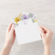 Invite a sus amigos y familiares con estilo y establezca el tono de su día especial con esta encantadora invitación a la ducha de bebé. El diseño presenta flores de color morado y amarillo y vegetación sobre fondo blanco.