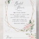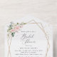 Invite a amigos y familiares con estilo y establezca el tono de su día especial con esta encantadora invitación a la ducha de novia. El diseño se caracteriza por las flores de color rosa y blanco, la vegetación, el confetti dorado y el marco dorado sobre fondo blanco.