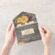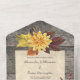 Tu día de bodas es una celebración del amor y la belleza de las temporadas cambiantes de la naturaleza. Esta invitación a la boda todo en uno capta el encanto rústico de la madera, el encanto de las hojas de otoño y la elegancia de los crisantemos dorados para crear una invitación realmente cautivadora para su día especial. Las invitaciones de boda todo en uno son hermosas y prácticas al combinar la invitación de boda con una postal RSVP fácil de quitar perforada. También son rápidos y fáciles de preparar para el correo. Simplemente dirija la invitación, doble el pliegue trasero y selle con los pegatinas claros incluidos. Una vez que sus invitados reciben la invitación, simplemente rompen la tarjeta RSVP perforada y la tiran por correo.