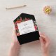 Diseño botánico de flor silvestre con un esquema de color rojo con amapolas, margaritas y rosas sobre un fondo gris oscuro con rectángulos blancos para texto. Código QR en la tarjeta RSVP.