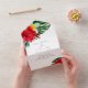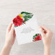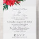 Esta invitación a la boda presenta un diseño todo en uno con una tarjeta R.S.V.P. incluida en la parte inferior. El fondo es un blanco sencillo y elegante con flores de colores tropicales hawaianas. Los ramos florales con hojas de palma, hibiscos y flores frangipanas acentúan las fronteras.