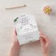 La invitación a la boda de Boho incluye hojas verdes.