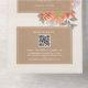 El follaje otoñal deja un diseño botánico con un esquema de color rojo con amapolas, margaritas y rosas sobre un fondo blanco roto con rectángulos inspirados en el material para texto. Código QR en la tarjeta RSVP.
