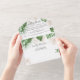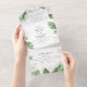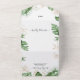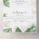 Muestre todos los detalles de su boda con esta elegante invitación de boda 'Todo en Uno', que presenta un fondo blanco clásico, caligrafía negra y letra cursiva, diseñada con follaje acuarela tropical suculento con flores doradas falsas. ¡Los invitados pueden arrancar fácilmente la tarjeta postal de RSVP y enviarla por correo! Edite fácilmente toda la información con los detalles de su boda utilizando la plantilla proporcionada. Invitaciones de boda asequibles todo en uno que dejará a sus invitados asombrados.