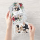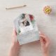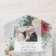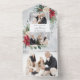 Este diseño clásico y tradicional presenta dos plantillas de fotos con un elemento central en blanco para su personalización sobre un fondo de poinsettias de color agua, rosas blancas y pino sobre un fondo gris polvoriento. Los paneles incluyen una foto adicional adicional de lágrimas y campos de texto editables sobre un fondo de color gris complementario.