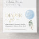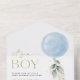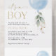 Invite a sus amigos y familiares con estilo y establezca el tono de su día especial con esta encantadora invitación a la ducha de bebé. El diseño presenta globo azul con hojas de eucalipto sobre fondo blanco.
