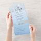 Captura la elegancia y el encanto de un maravilloso país invernal con esta invitación de boda azul todo en uno. El fondo de degradado azul con copos de nieve blancos, junto con la comodidad de un diseño todo en uno, crean una impresionante suite de invitados que prepara el escenario para tu mágica boda de invierno.
