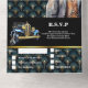 Un fondo de diseño de arte deco azul océano y dorado tiene incrustaciones negras con fondo de oro falso en el que aparecen las plantillas blancas para la redacción personalizado. Una acuarela Flapper bride y un hombre de la era Gatsby aparecen uno al lado del otro vestido de forma. Ella lleva un cinturón con la cabeza y un elegante corte de pelo mientras se ve adornado con un traje de tres piezas y un gorra. En la parte inferior de la lágrima aparece un coche de automóvil esquivo que los clientes pueden enviar a su boda. En esta parte de la invitación aparecen los detalles de su preferencia de comida y su dirección de retorno. La parte delantera tiene plantillas para la dirección postal de los huéspedes, además de un diseño decorativo Art Deco en la parte superior. Son ideales para los bodas temáticos "Great Gatsby", aniversarios y eventos corporativos. Esta invitación "todo en uno" es asequible y fácil de usar.