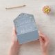 Todo ello en una invitación nupcial con flores de bonito, nombres de estilo característico y tipografía de moda sobre un polvoriento fondo azul. La invitación incluye una tarjeta RSVP perforada que incluye el código QR de su sitio web boda. Diseñado por Thisisnotme©