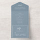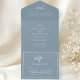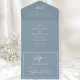 Esta invitación "todo en uno" presenta un polvoriento fondo azul combinado con un moderno tipo de letra de guión, exuberante elegancia minimalista. El diseño claro y fácil de leer garantiza que sus huéspedes reciban toda la información esencial para su celebración boda. Más que sólo una invitación, este versátil diseño le permite personalizar los detalles de su ceremonia, recepción, RSVP, y cualquier información adicional que desee compartir. Con su estilo atemporal y su suave matiz, esta invitación completa perfectamente una variedad de temas bodas, desde románticos y modas hasta modernos y sofisticados.