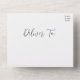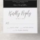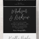 Invitación nupcial moderna que incluye sus iniciales, nombres y detalles de bodas en un sencillo guión en blanco con un fondo negro. La invitación a la boda en blanco y negro todo en uno incluye una postal RSVP.