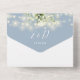 Invitación nupcial azul polvorienta todo en uno con luces de cuerdas de bonito, vegetación floral y tipografía elegante. La invitación incluye una tarjeta RSVP perforada con el código QR de su sitio web boda y detalles. Diseñado por Thisisnotme©