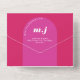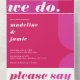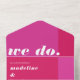 Nuestra mínima y audaz invitación a una boda al estilo retro es perfecta para la pareja de moda a la que le encanta destacar y hacer una declaración audaz. Nuestro diseño presenta una combinación de colores vivos de color rosa-magenta. Las formas simples de arco abstracto y de círculo crean un aspecto audaz con "Lo hacemos". Se muestra audazmente en un tipo de letra blanco grande. El texto en negrita y el estilo retro moderno crean un diseño atrevido y moderno. Diseñado por Moodthology Papery