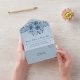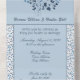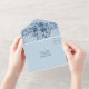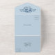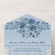 Hermoso Harbour Blue todo en una sola invitación con un tallo y cabecera floral azul. En el exterior se encuentra un armazón de flores a juego y en el desgarrador de la respuesta. El texto incluye el espacio para el nombre y la dirección del invitado en la parte posterior, con un espacio para un sello. El texto de desgarro incluye la dirección de retorno de las novias y espacio para un sello como respuesta.
