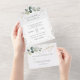 Moderno y elegante todo en una sola Invitación de Boda con fácil desgarro de RSVP. Este diseño presenta un ilustracion acuático de hojas de eucalipto y hojas doradas.