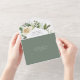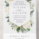 Nuestra invitación a la boda de Marfil Bloom rodea los detalles del día de la boda con un marco geométrico moderno de vegetación acuática pintada, hojas de eucalipto, follaje botánico y flores blancas de rosa y peonía.