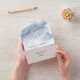 Un guion de caligrafía boda giratorio contra el fondo de una acuarela oceánica-azul hace una presentación excepcional para cualquier boda moderno de primavera o verano. Personalice todos los detalles de su boda en la guía anterior para que sea su propio.