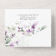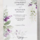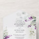 Las flores de la invitación son suaves y románticas, adornadas en suaves tonos violeta con una textura acuarela. Parecen flores silvestres o flores de jardín (tal vez lavanda, lila o anémona) agrupadas vagamente entre hojas verdes delgadas. El acondicionamiento se organiza verticalmente a lo largo de la parte izquierda, añadiendo una elegancia natural y ventilada que completa el diseño con un toque de encanto de temporada. El texto es fácil de personalizar con su propia información.