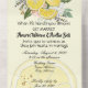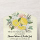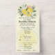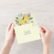 Hermoso limón amarillo todo en una invitación con limones y solapa de apertura floral. En el interior encontrarás una versión más ligera de una rebanada de limón en el desgarrador de respuesta. El texto incluye el espacio para el nombre y la dirección del invitado en la parte posterior, con un espacio para un sello. El texto de desgarro incluye la dirección de retorno de las novias y espacio para un sello como respuesta.