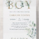 Todo ello en una tarjeta de invitación a la ducha para bebés, con eucalipto de color agua pintado y hojas verdes con letras botánicas de oro. Para una personalización más avanzada de este diseño, haga clic en el vínculo Personalizar adicional para cambiar el tipo de letra, el tamaño y el color.