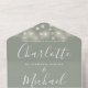 Todo en una invitación de boda con luces de cadena de bonito y nombre de guión elegante y iniciales de monograma en un fondo verde sabio. La invitación incluye una tarjeta RSVP perforada con el código QR de su sitio web boda y detalles. Diseñado por Thisisnotme©