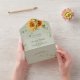 Esta invitación inspirada en el campo incluye girasoles acuáticos con delicadas viñas verdes sobre un fondo verde de sabio claro, perfecto para cualquier boda de estilo rústico. Las invitaciones de boda todo en uno son hermosas y prácticas al combinar la invitación de boda con una postal RSVP fácil de quitar perforada. También son rápidos y fáciles de preparar para el correo. Simplemente dirija la invitación, doble el pliegue trasero y selle con los pegatinas claros incluidos. Una vez que sus invitados reciben la invitación, simplemente rompen la tarjeta RSVP perforada y la tiran por correo.