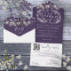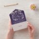 Invitación de boda todo en uno con hermosas luces de cadena, guirnalda floral dibujada a mano y tipografía chic sobre fondo morado. La invitación incluye una tarjeta de RSVP perforada con el código QR del sitio web de su boda y detalles. Diseñado por Thisisnotme©